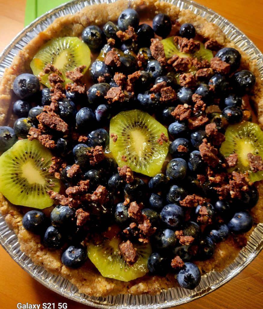 - Onctueuse tarte au chocolat noir sur croute de noix, garnie de petits fruits